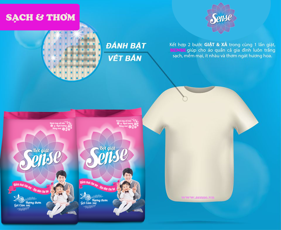 Với sự đa dạng và sáng tạo không ngừng đã cho ra đời nhiều sản phẩm giải quyết được nỗi lo giặt xả của người dùng. Sản phẩm bột giặt Sense có khả năng tẩy sạch nhanh chóng mọi vết bẩn cứng đầu. Nó giúp mang đến những bộ quần áo trắng sạch như mới.