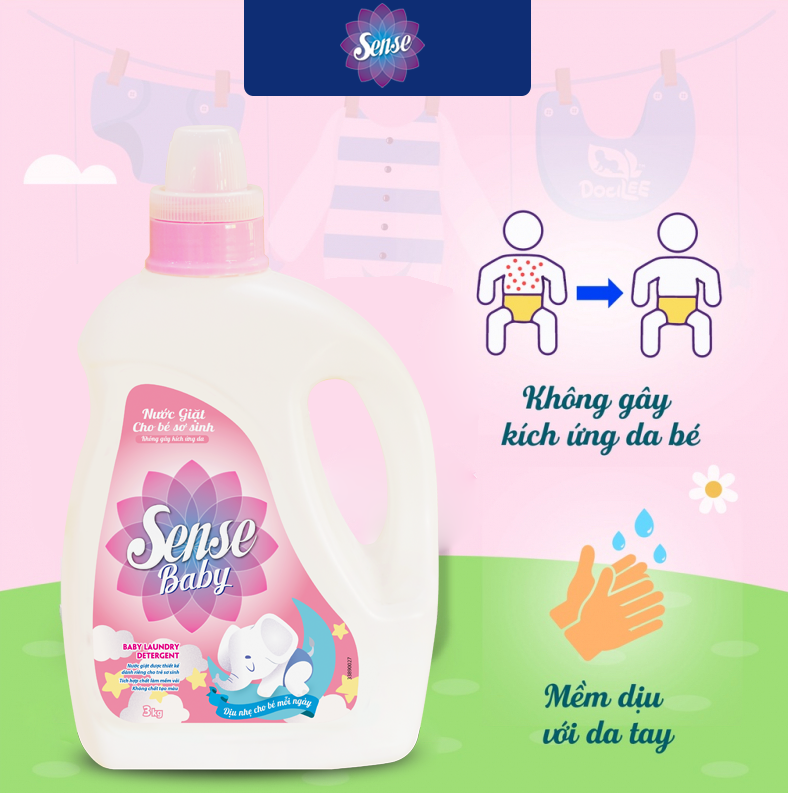 Với Sense, áo quần mềm mại luôn là một yếu tố quan trọng nhất để bé có những phút giây chơi đùa thật thoải mái và dễ chịu. Sense Baby được chế tạo bởi công thức đặc biệt, dành riêng cho bé sơ sinh, giúp đánh bật các vết bẩn và Polyalate sẽ ngăn chặn vết bẩn quay trở lại, không gây kích ứng cho làn da nhạy cảm của bé, vừa an toàn cho da tay của Mẹ.