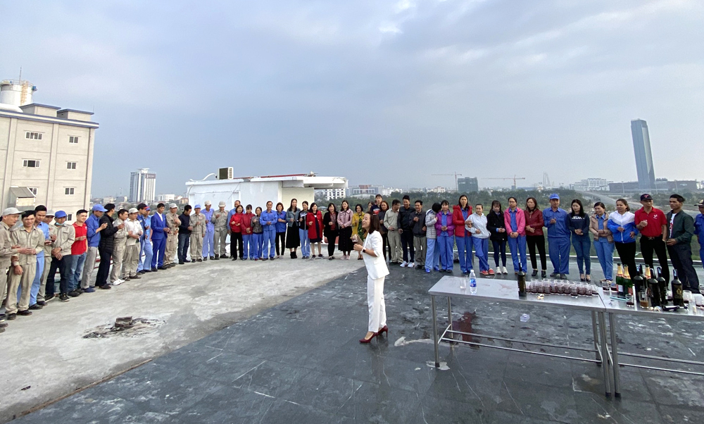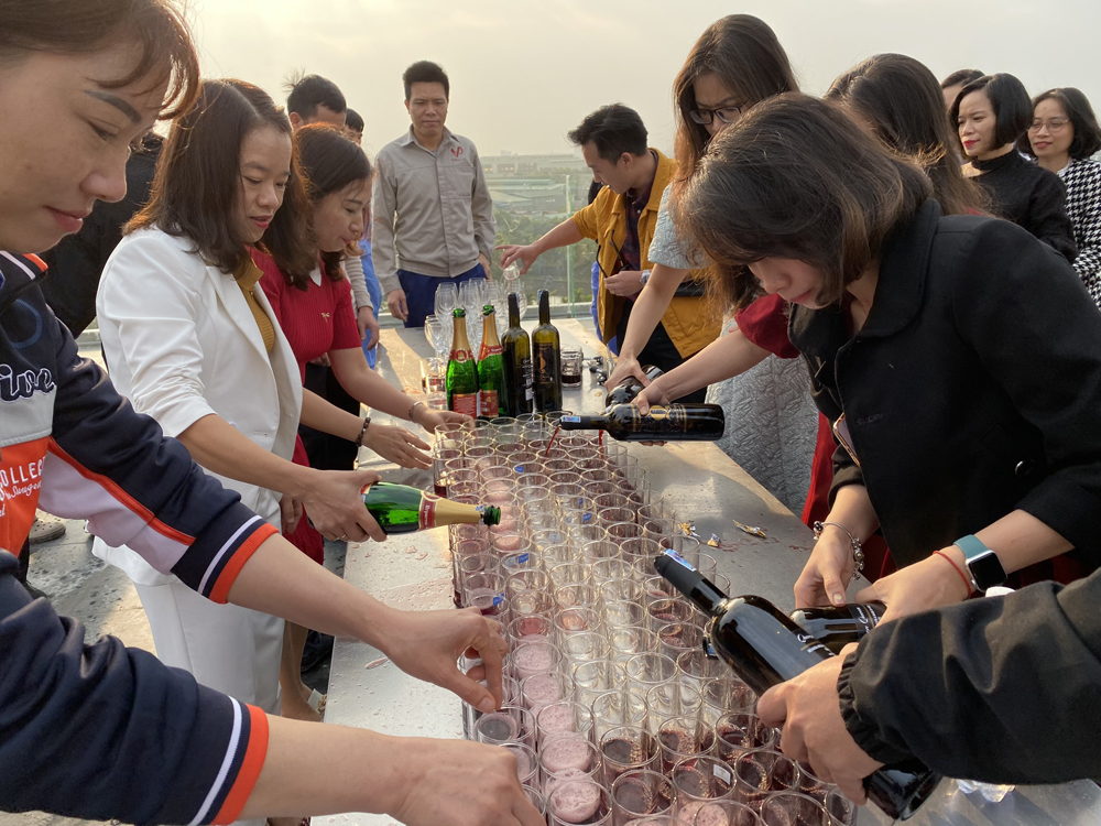Bà Nguyễn Thị Thanh Hương cùng các cán bộ công ty mở sâm panh chúc mừng năm mới