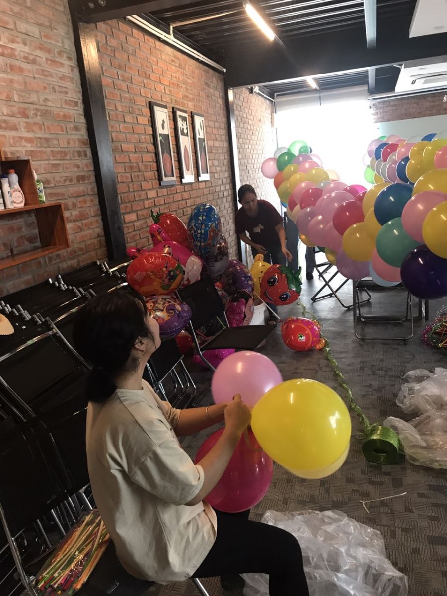 Các cán bộ công nhân viên cùng nhau chuẩn bị bóng bay để trang trí trong đêm hội