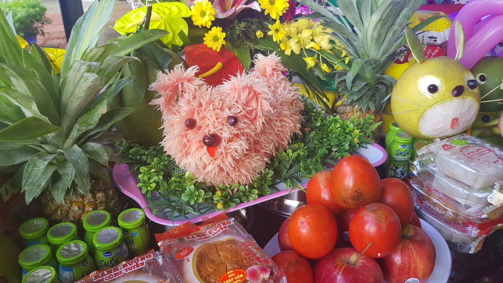 Mâm cỗ trung thu được các chị em phụ nữ trong công ty chuẩn bị với các loại bánh kẹo, hoa quả đầy màu sắc. Chú chó bông hay chú thỏ được tạo hình bằng bưởi mang lại nét không khí truyền thống cho mâm cỗ trung thu.