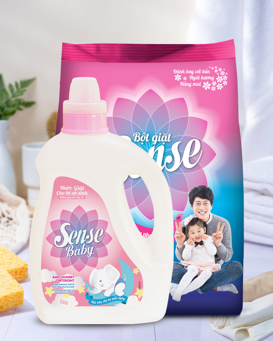 Bộ đôi nước giặt cho bé sơ sinh và bột giặt Sense trắng sạch, mềm mại, an toàn cho cả gia đình