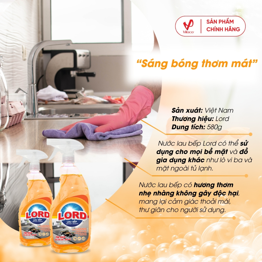 Nhờ công thức chứa chiết xuất hương chanh tự nhiên cùng các hoạt chất làm sạch mạnh mẽ, Lord giúp đánh bay vết dầu mỡ cứng đầu, vết cháy khét và cặn bám lâu ngày trên bếp ga, bếp từ, tường bếp, máy hút mùi... mà không cần chà mạnh tay.