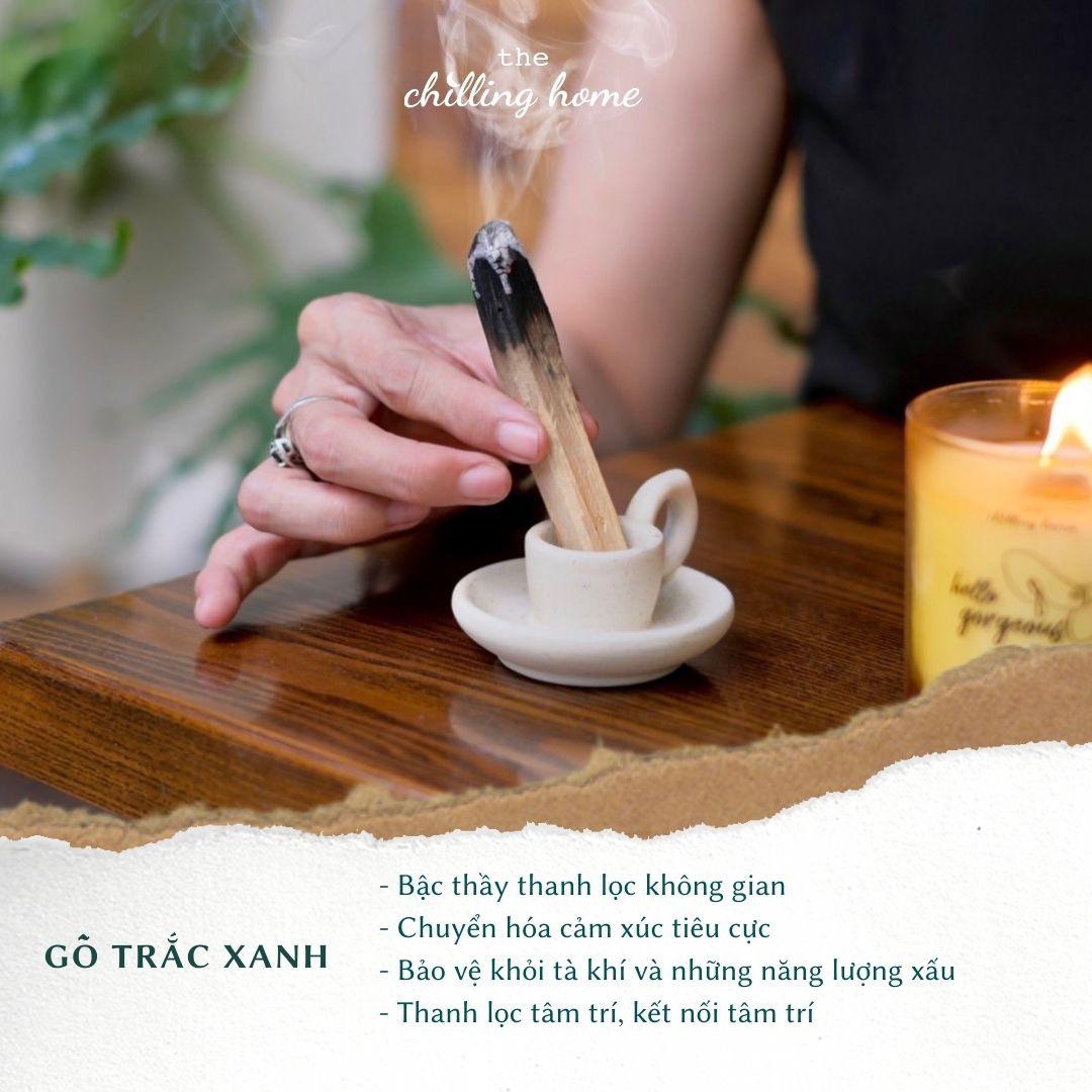 Theo các nghiên cứu, gỗ Palo Santo (còn gọi là gỗ trắc xanh) có khả năng làm giảm các triệu chứng cảm cúm, đau đầu, căng thẳng và lo lắng. Vì thế, để cải thiện nguồn năng lượng trong không gian sống, bạn có thể cho một lượng nhỏ gỗ này vào khay để đốt. Mùi hương của trắc xanh sẽ khiến không khí nhà ở trong lành và dễ chịu hơn.