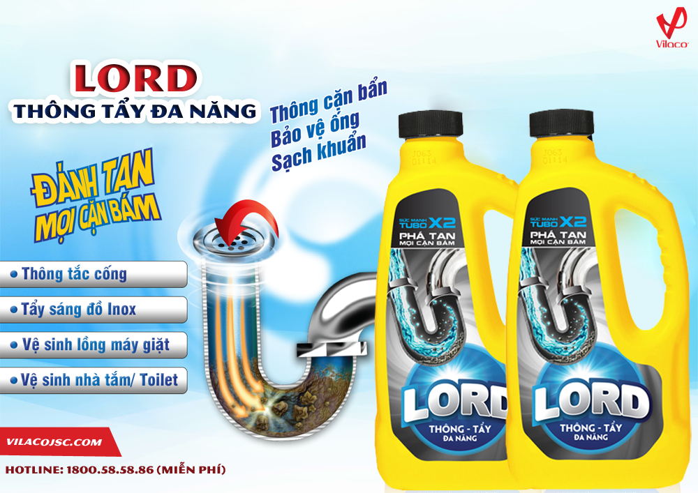 Hiện nay đa phần trên thị trường người tiêu dùng thường sử dụng thông cống dạng bột để xử lý các tình trạng này. Tuy nhiên, đối với trường hợp đường cống bị nghẹt nặng, nhiều bột thông cống không phát huy được tác dụng mà còn khiến các bà nội trợ mất rất nhiều thời gian. Thông tẩy đa năng Lord - Sạch vết bám, sáng bề mặt. Thông tẩy đa năng Lord cho nhà cửa luôn sạch mát mang lại sức mạnh tẩy rửa vượt trội, giúp bồn cầu, bồn rửa tay…luôn thông thoáng.