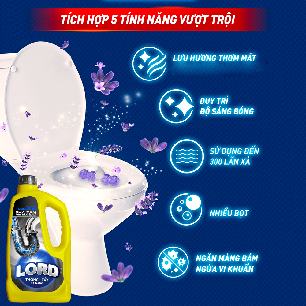 Lord thông tẩy đa năng loại bỏ đến 99% các loại vi khuẩn bám trên các bề mặt của nhà vệ sinh, phòng tắm và các khu vực khác.