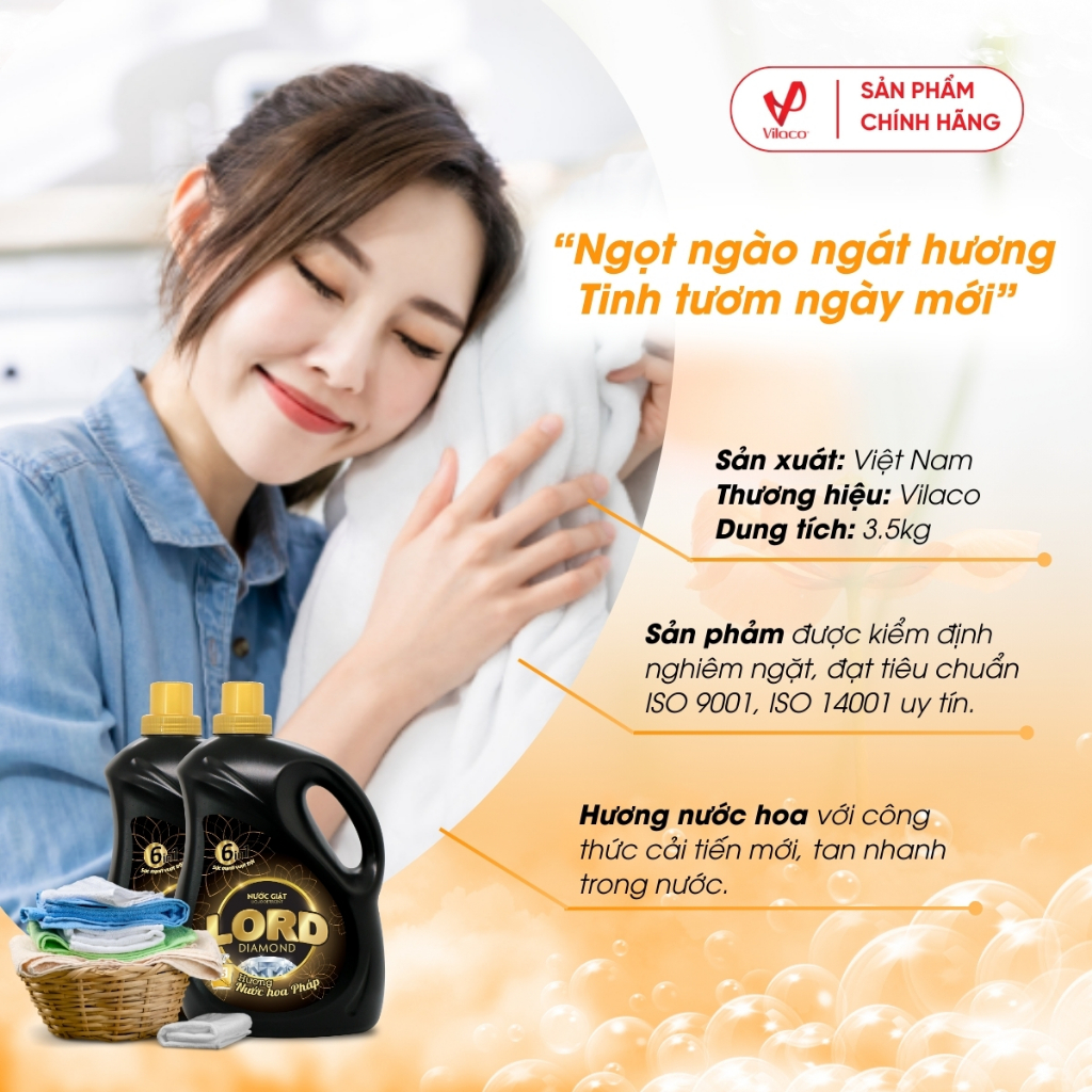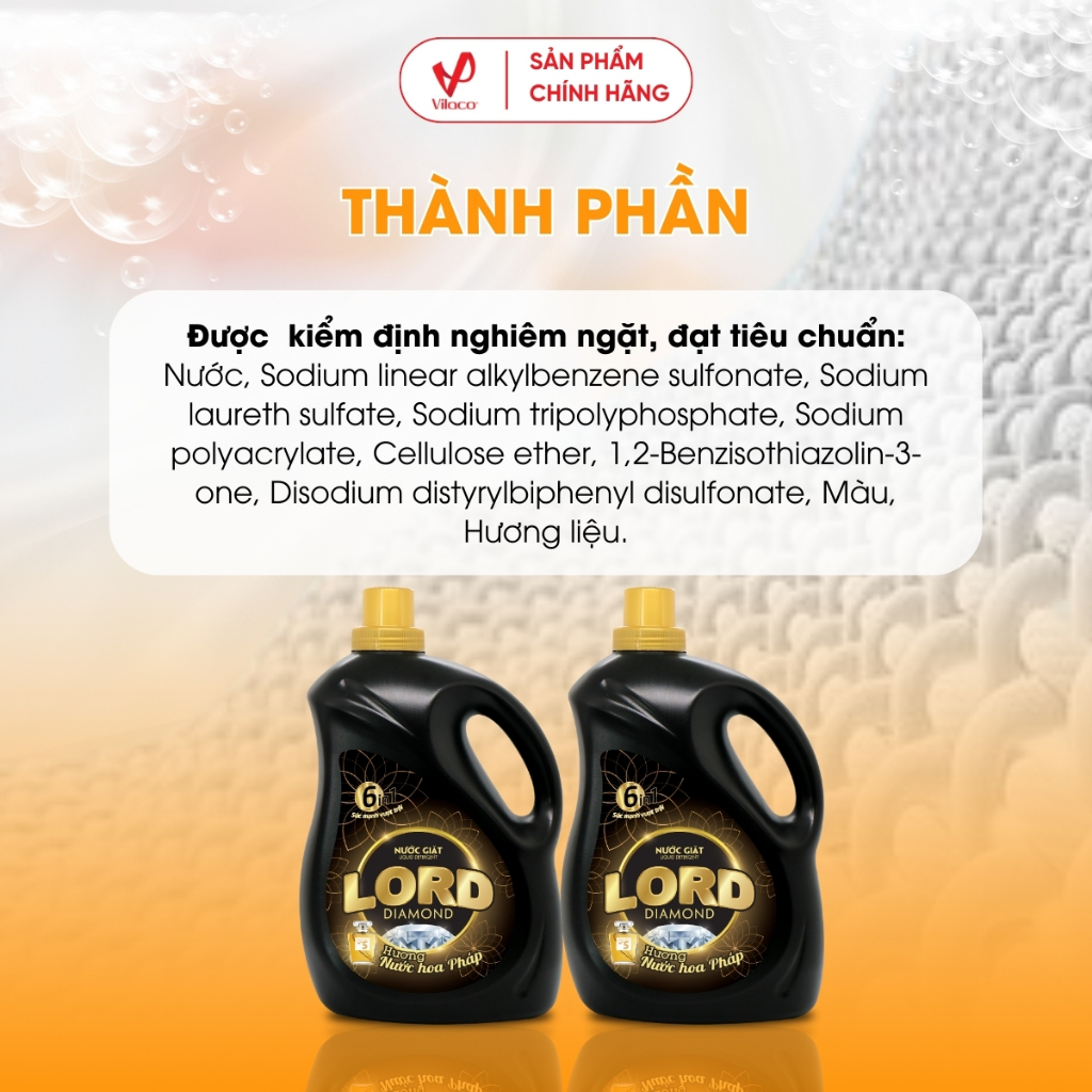 Nước giặt Lord Diamond hương nước hoa Pháp - sản phẩm được quản lý bằng hệ thống quản lý chất lượng đạt tiêu chuẩn ISO 9001:2015. Nước giặt Lord Diamond hương nước hoa Pháp với tinh chất nước hoa Pháp siêu đậm đặc, đánh tan mọi vết bẩn cứng đầu, giúp quần áo luôn sạch và mềm mại, lưu giữ hươmg thơm lâu ngày. Tăng độ bền cho quần áo, lưu giữ màu sắc quần áo luôn trắng sáng như mới.