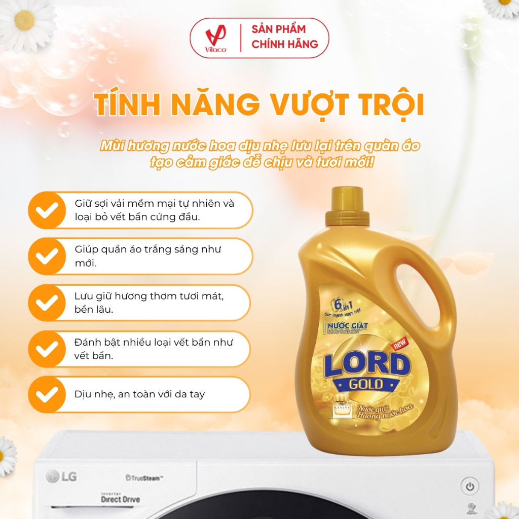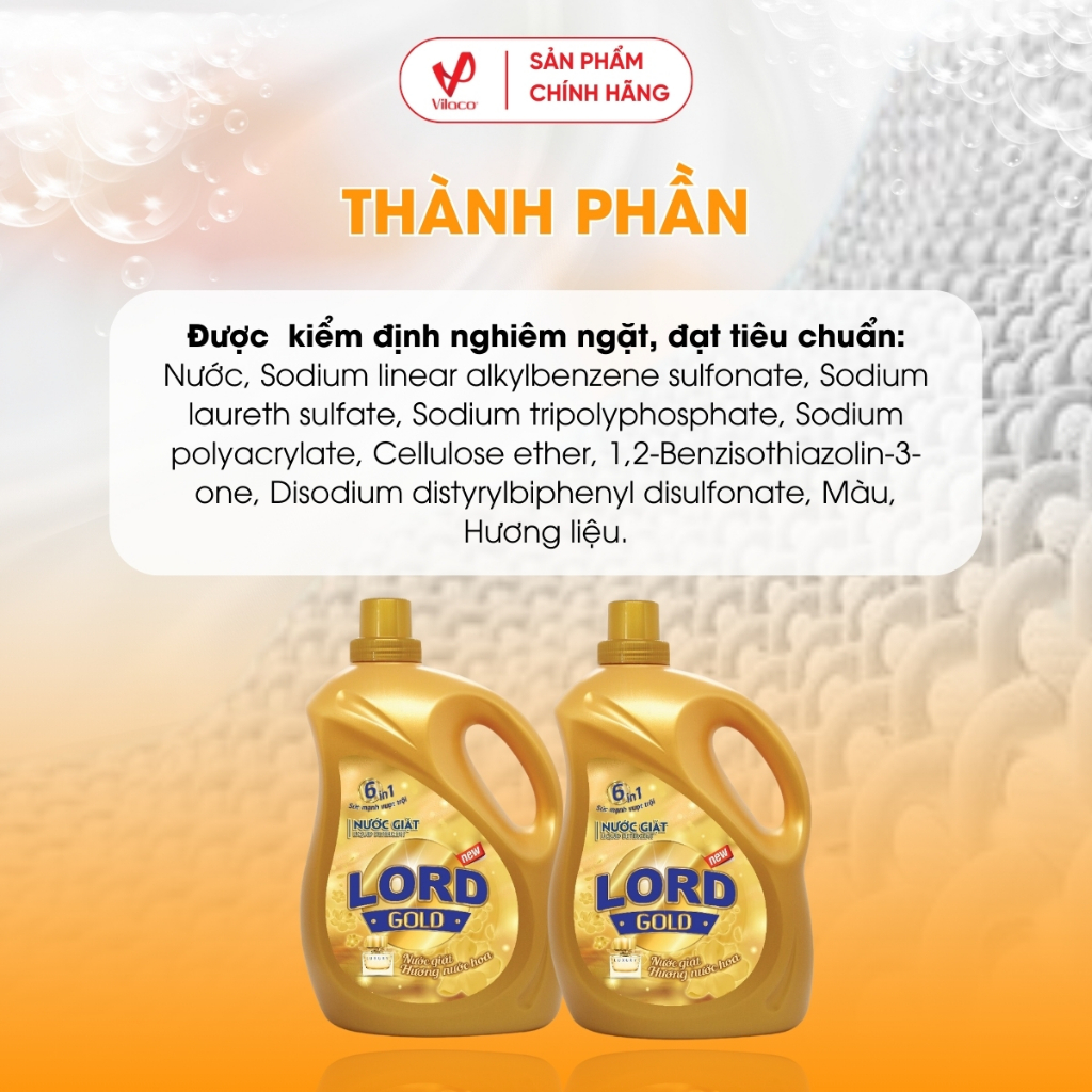Nước giặt hương nước hoa Lord Gold Sản phẩm được quản lý bằng hệ thống quản lý chất lượng đạt tiêu chuẩn ISO 9001:2015. Với công thức hoàn toàn mới giúp các hạt tẩy được hoà tan dễ dàng trong nước, vừa mang lại sự tiện lợi cho người sử dụng, vừa đánh tan mọi vết bẩn, diệt mọi vi khuẩn, cho quần áo trắng sạch như mới.