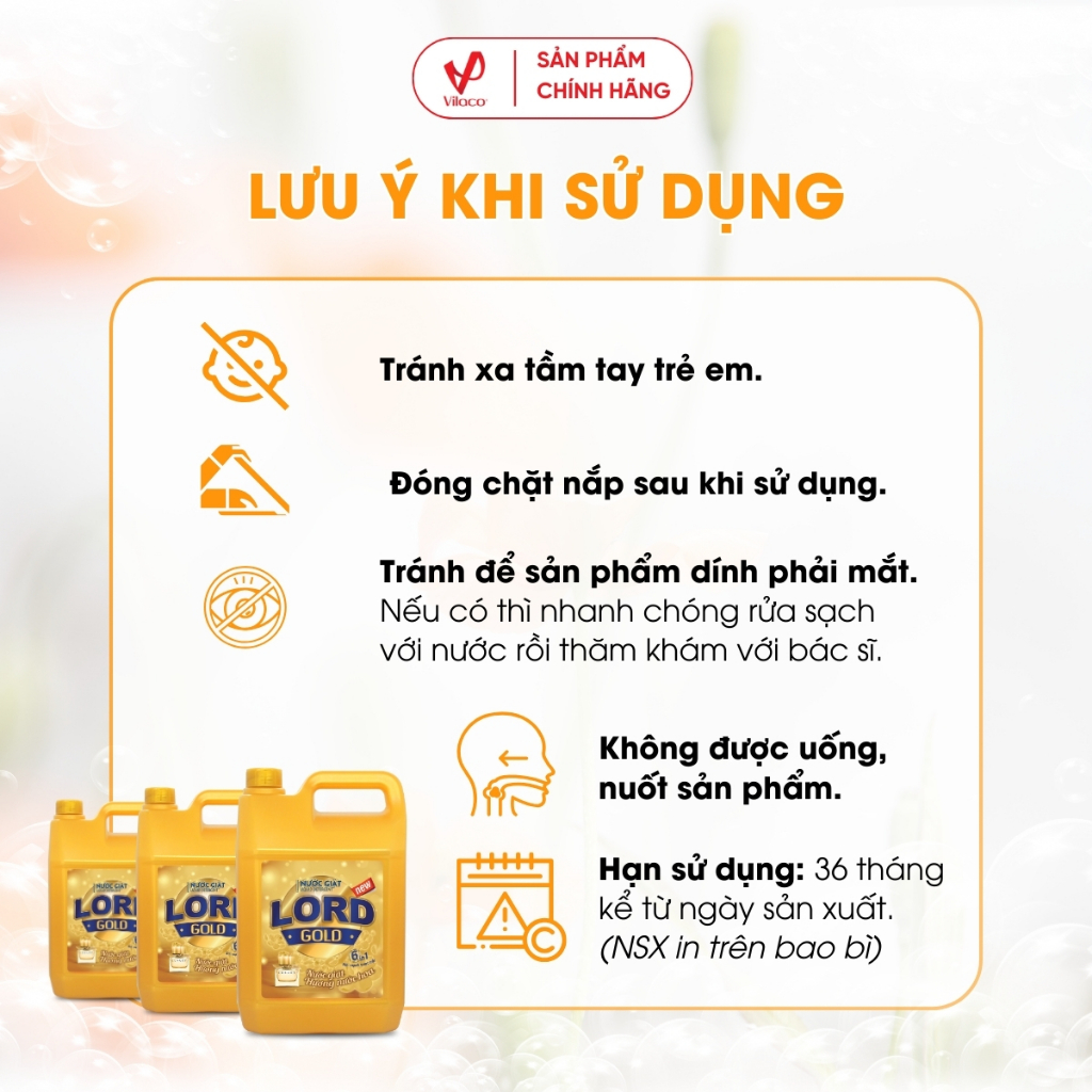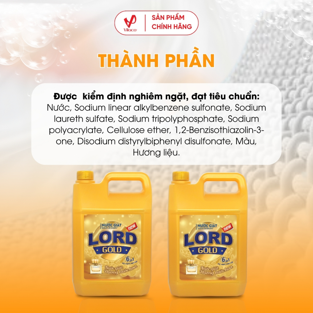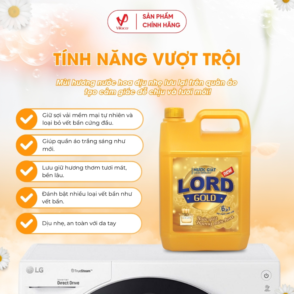 Nước giặt hương nước hoa Lord Gold Sản phẩm được quản lý bằng hệ thống quản lý chất lượng đạt tiêu chuẩn ISO 9001:2015. Với công thức hoàn toàn mới giúp các hạt tẩy được hoà tan dễ dàng trong nước, vừa mang lại sự tiện lợi cho người sử dụng, vừa đánh tan mọi vết bẩn, diệt mọi vi khuẩn, cho quần áo trắng sạch như mới.