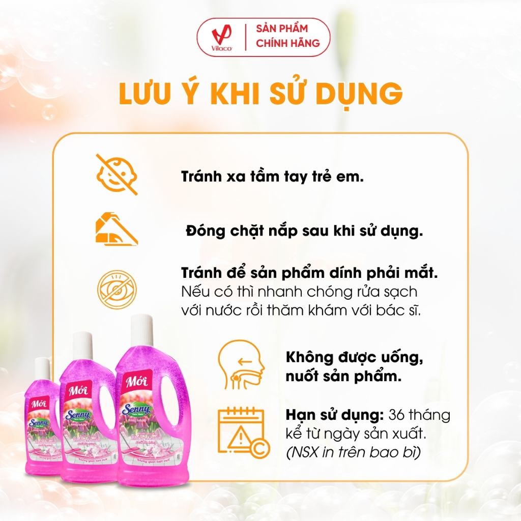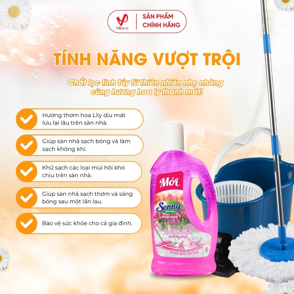 • Đặc biệt với công thức hoàn toàn mới, nước lau sàn Senny hương hoa Lily giúp làm sạch bóng sàn nhà, làm sạch vết bám lâu trên nền nhà, diệt vi khuẩn hữu hiệu, giúp bảo vệ sức khỏe cho cả gia đình.
