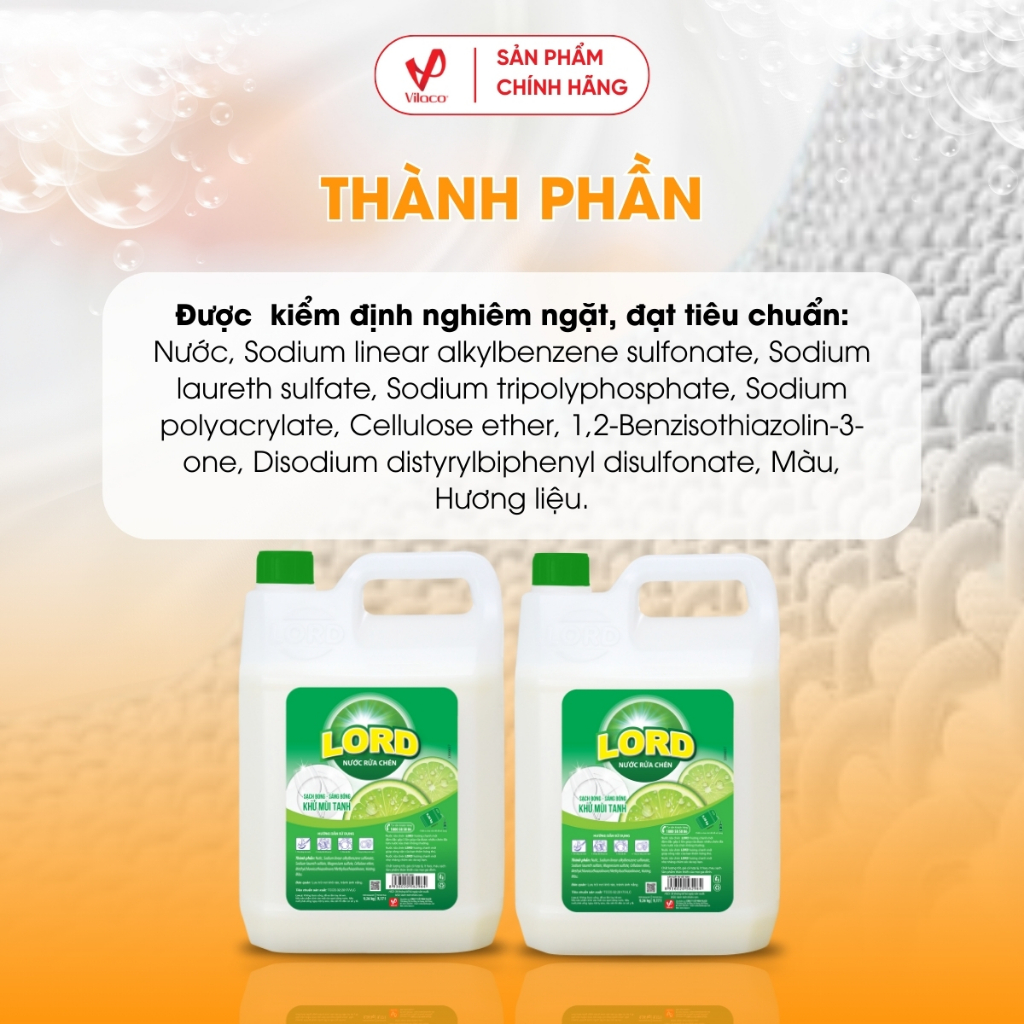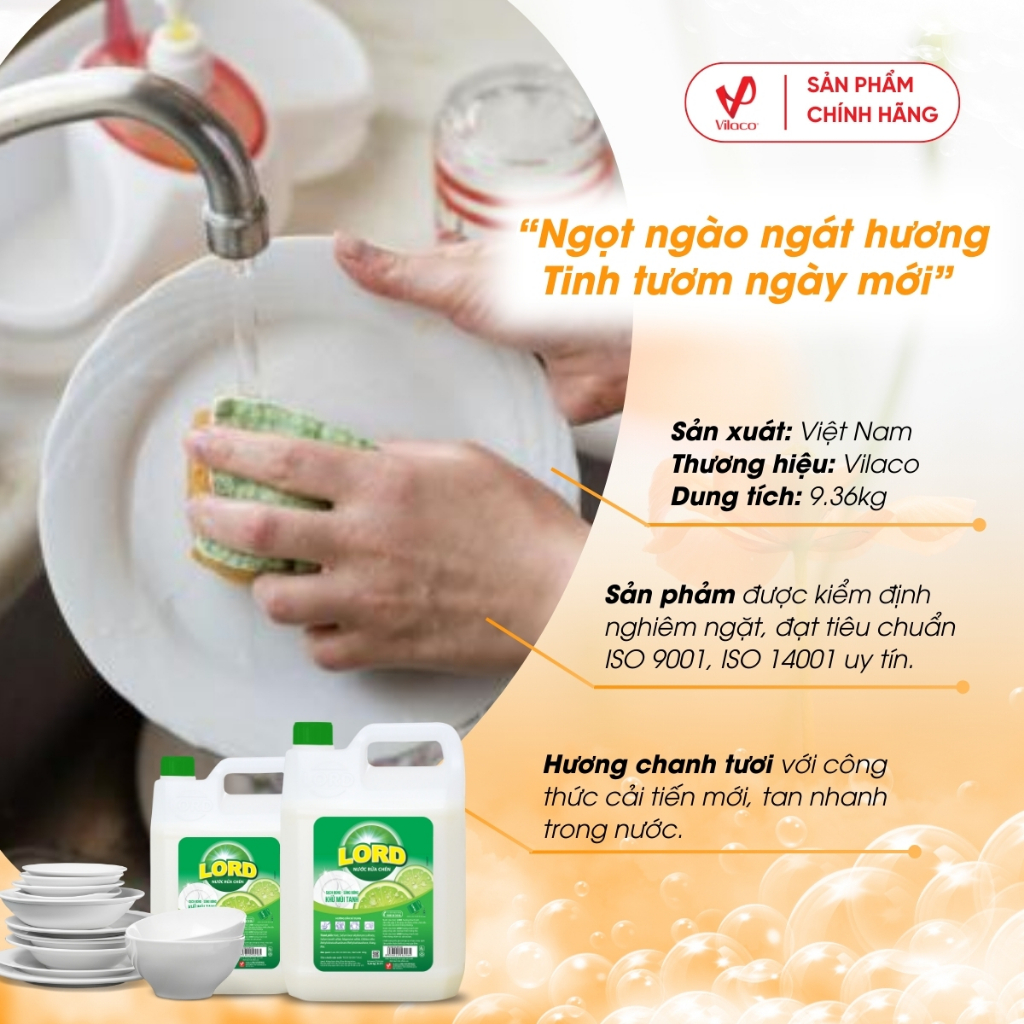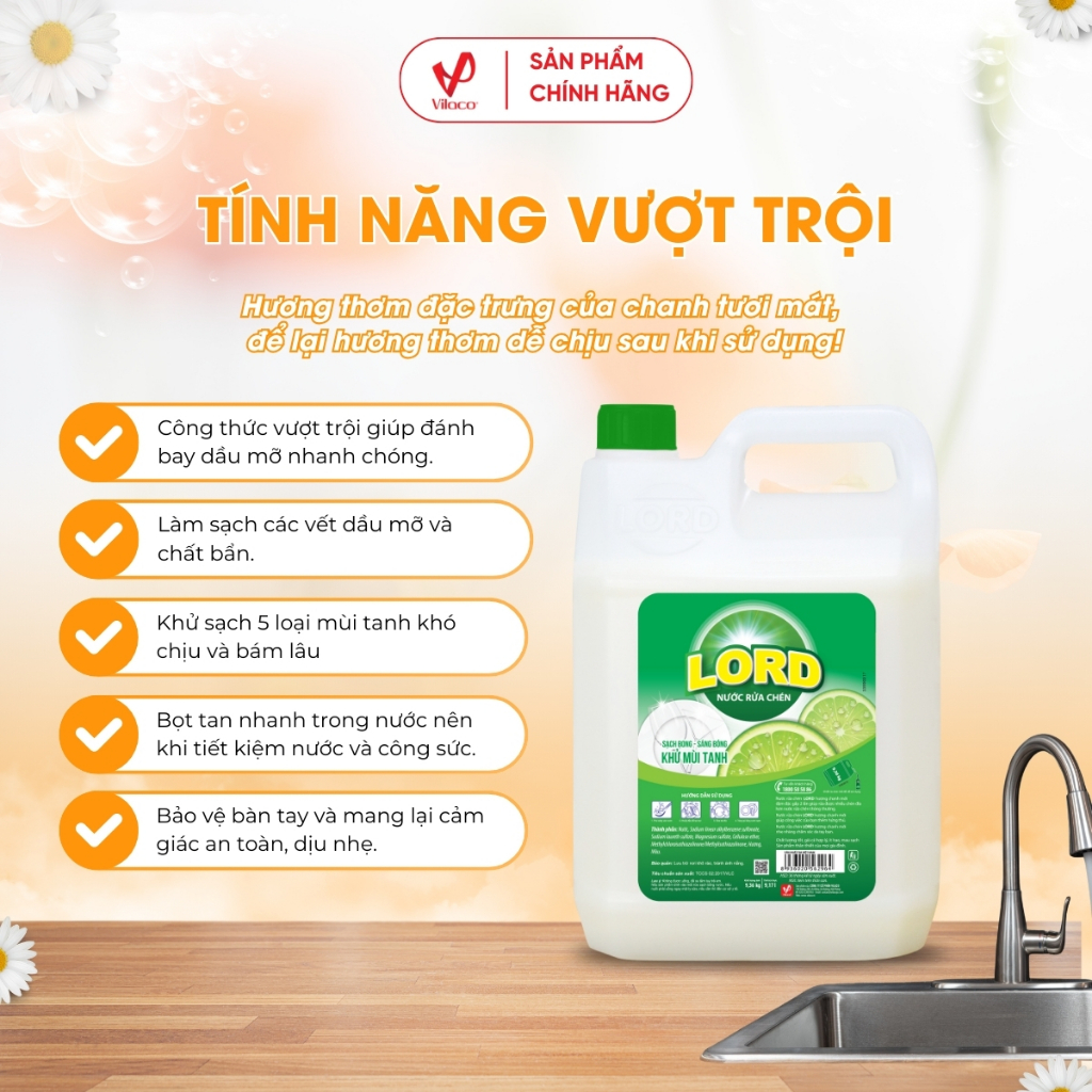 Nước rửa chén LORD Chanh công thức cải tiến mới của Vilaco đậm đặc gấp 2 lần kết hợp với tinh chất chất Chanh giúp đánh tan vết bẩn và dầu mỡ, đặc biệt không làm hại da tay. Sản phẩm con hơn hẳn các loại nước rửa chén khác về hiệu quả tẩy sạch các vết bẩn dầu mỡ, diệt trùng và khử mùi tanh, giúp chén đĩa nhà bạn luôn sạch và sáng bóng.
