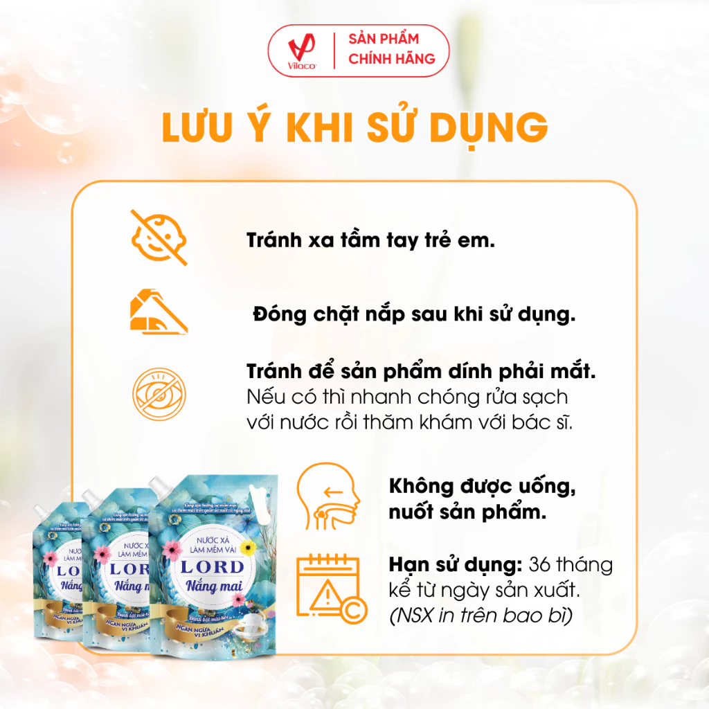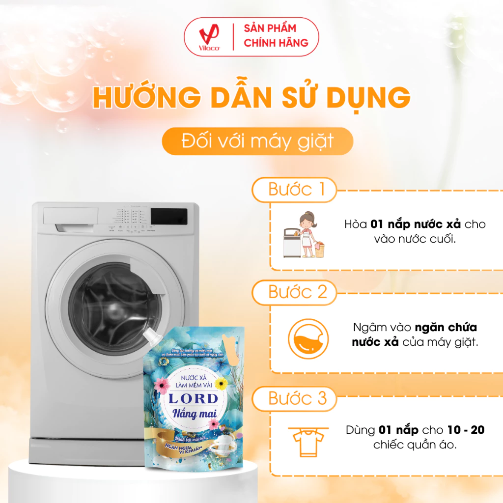 • Sau khi giặt, pha loãng nước xả Lord Nắng Mai theo tỷ lệ hướng dẫn.