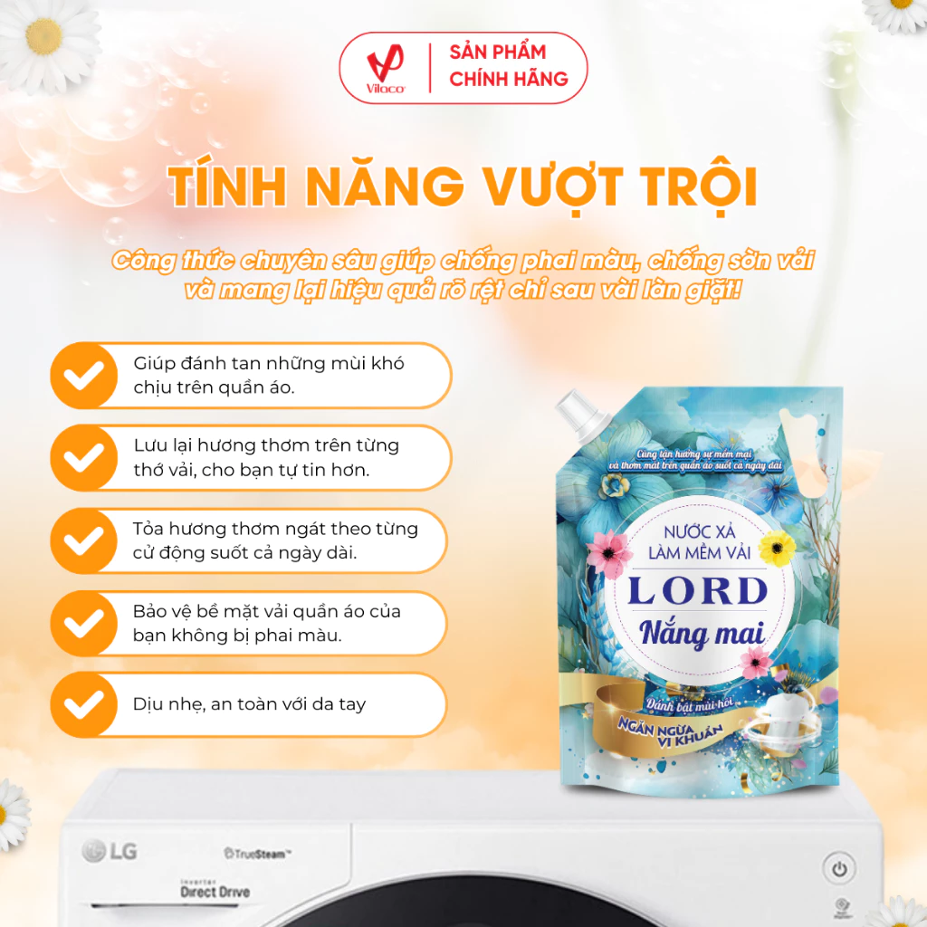 Lord Nắng Mai không chỉ làm mềm mà còn bảo vệ quần áo khỏi tĩnh điện, giúp trang phục luôn giữ được dáng đẹp và bền màu.