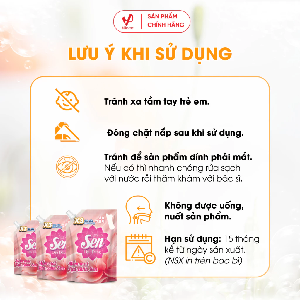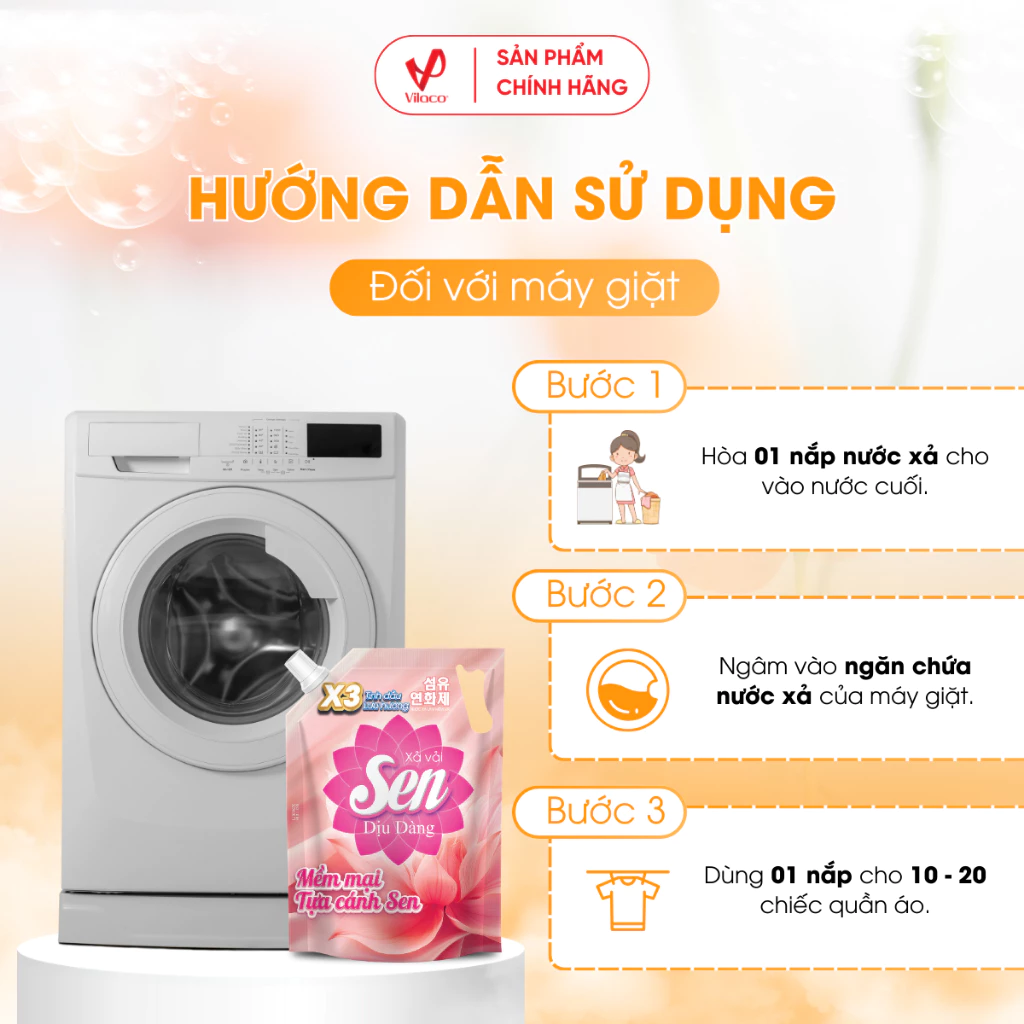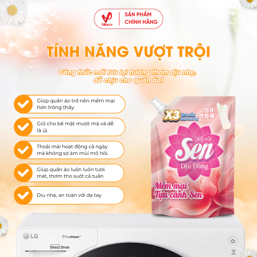 - Nước xả vải Sen Dịu Dàng với công thức đậm đặc cùng hương nước hoa sang trọng được lưu giữ cực lâu trên quần áo.
