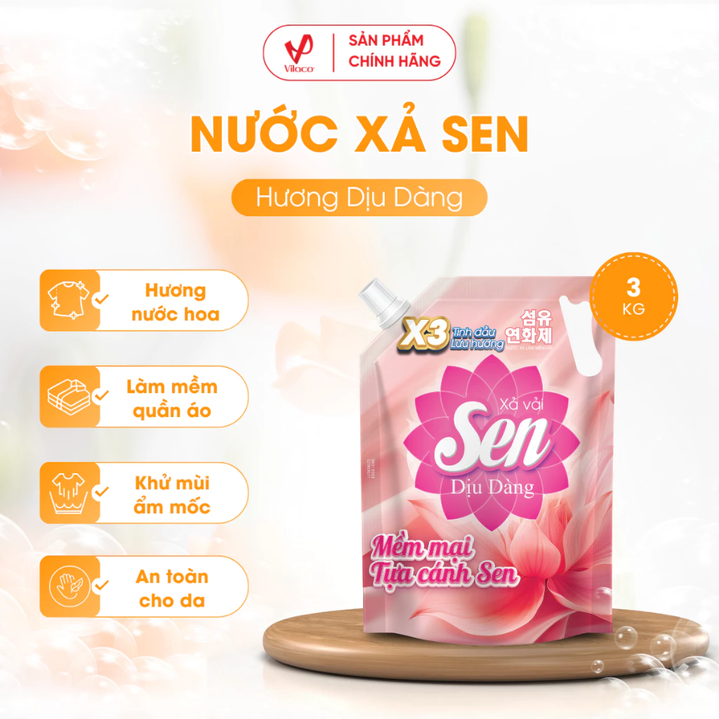 Nước Xả Làm Mềm Vải Sen Dịu Dàng hương nước hoa dịu nhẹ thơm lâu khử mùi ẩm mốc an toàn cho da. Với dung tích 3kg, sản phẩm vừa tiết kiệm vừa đáp ứng nhu cầu sử dụng lâu dài.