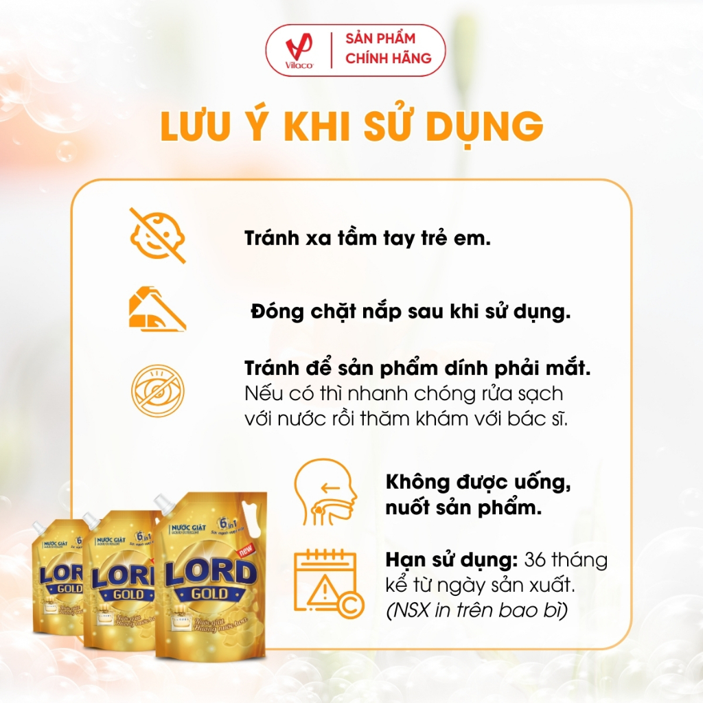 Nước giặt hương nước hoa Lord Gold Sản phẩm được quản lý bằng hệ thống quản lý chất lượng đạt tiêu chuẩn ISO 9001:2015. Với công thức hoàn toàn mới giúp các hạt tẩy được hoà tan dễ dàng trong nước, vừa mang lại sự tiện lợi cho người sử dụng, vừa đánh tan mọi vết bẩn, diệt mọi vi khuẩn, cho quần áo trắng sạch như mới.